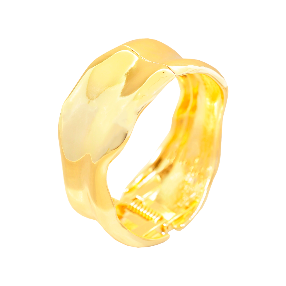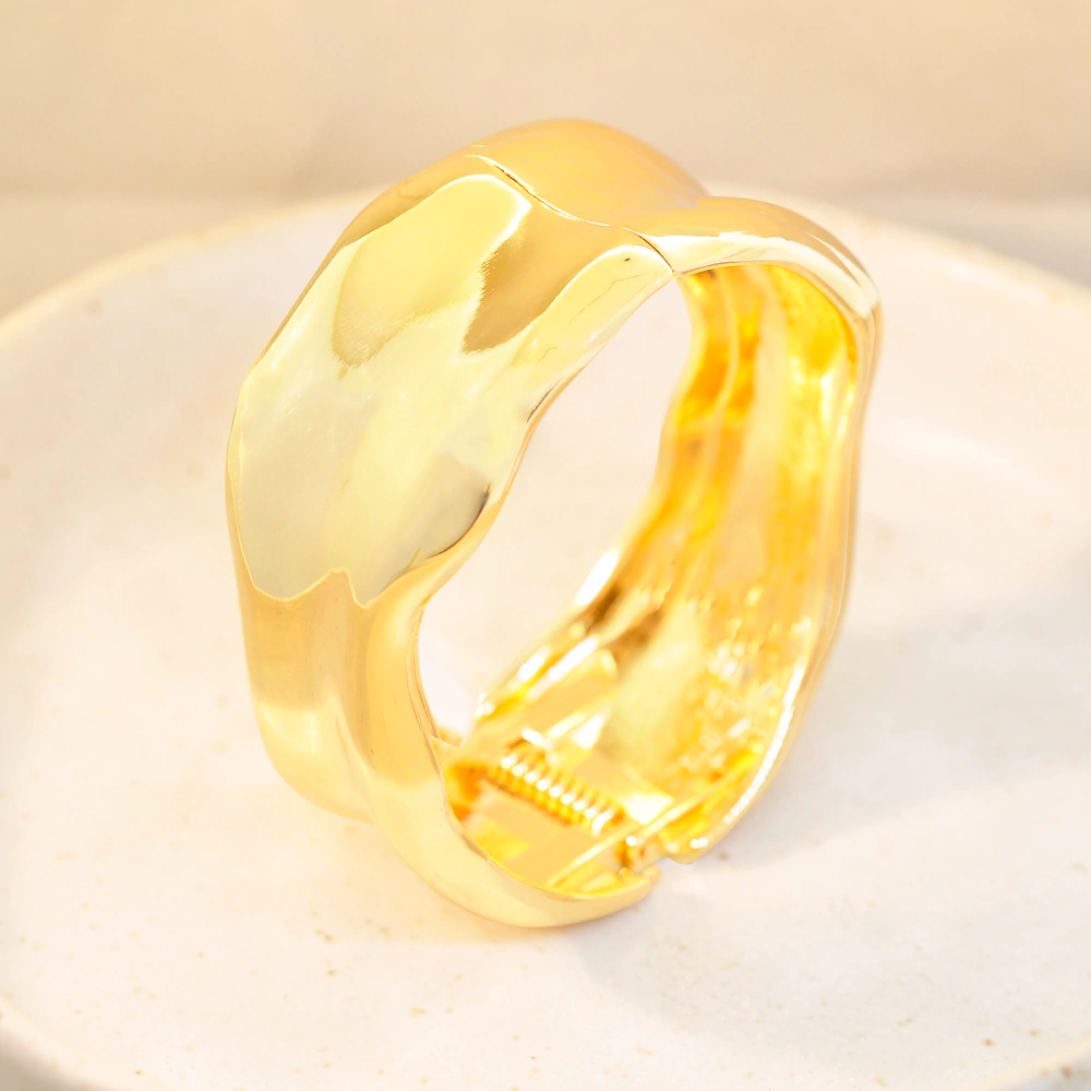 É uma bijuteria em metal dourado, bracelete orgânico espelhado e destacam quando combinados com roupas de cores neutras ou tons terrosos, criando um visual harmonioso. Eles se adaptam muito bem a estilos mais descontraídos, como o boho ou casual, combinando com vestidos soltos, saias longas e sandálias rasteiras. Para um toque ousado, use o bracelete orgânico com roupas mais elegantes, criando um contraste interessante entre o rústico e o refinado.