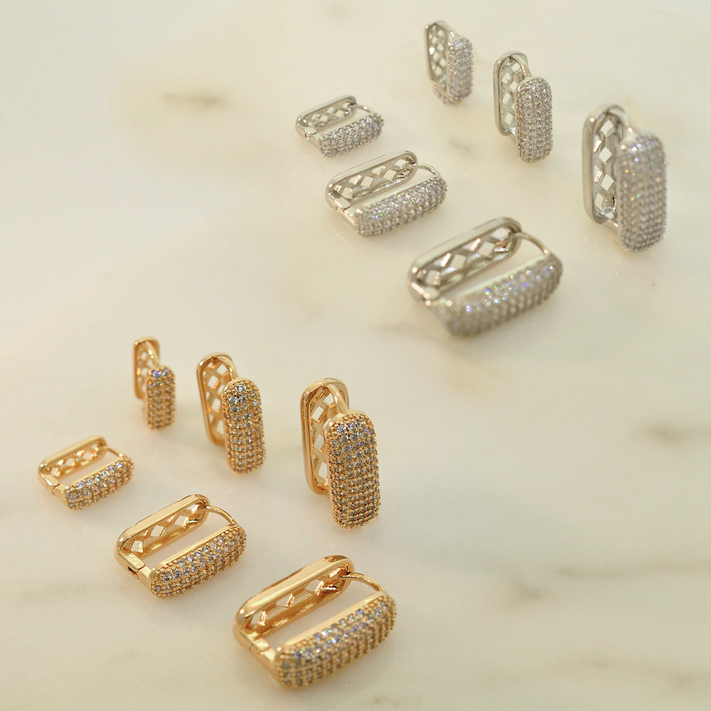 O trio é composto por três argolas retangulares em tamanhos variados, todas cravejadas com micro zircônias que garantem um brilho marcante. O formato geométrico confere um ar contemporâneo à peça, enquanto o banho dourado reforça o charme e a elegância do conjunto. As linhas bem definidas e a base estruturada trazem presença visual com leveza.