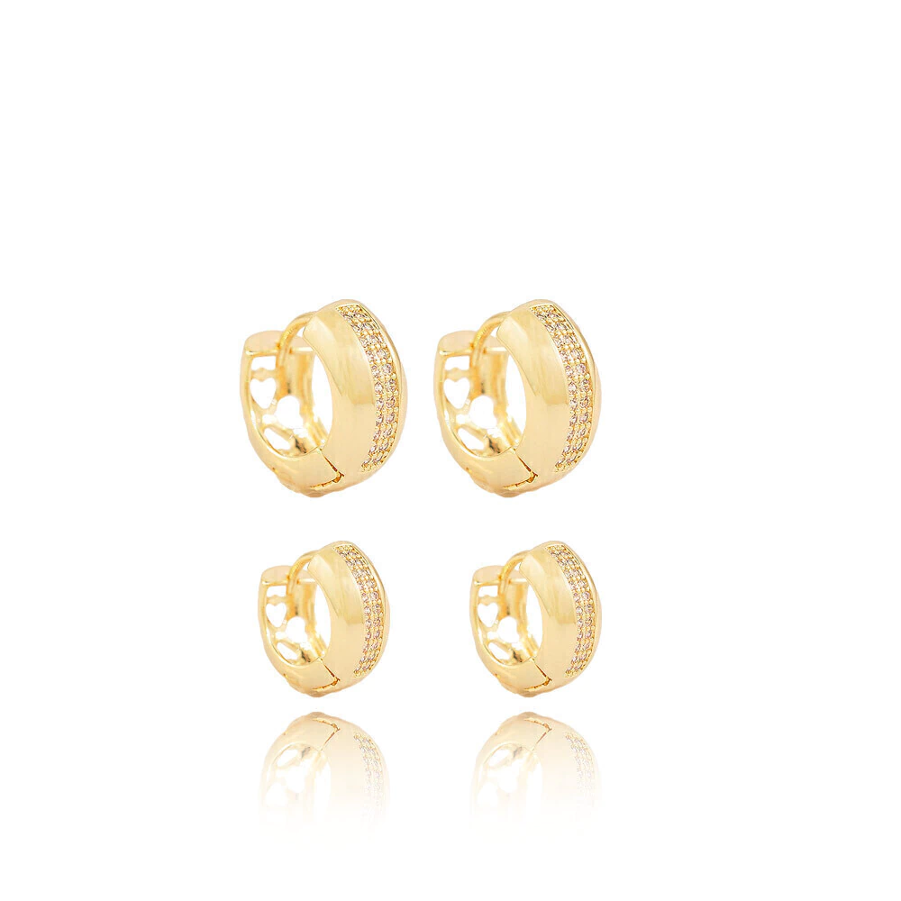 É uma semijoia em banho de ouro 18k, Você pode usar uma argola cravejada em cada lóbulo da orelha para um visual simétrico e elegante. Se tiver vários furos, pode combinar as argolas cravejadas com outros tipos de brincos para um visual mais complexo e personalizado.