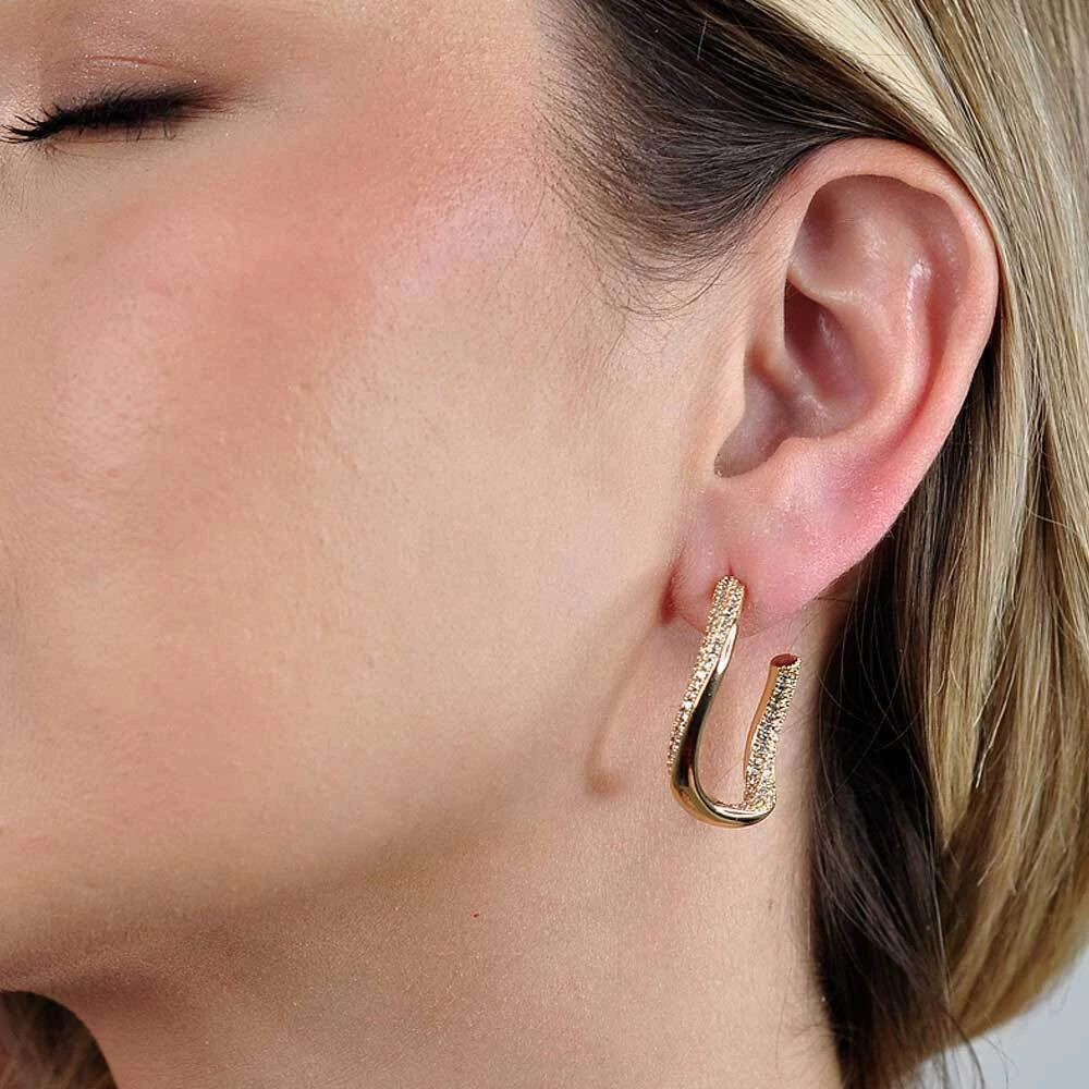 O Brinco Argola Torcida Cravejada é uma peça sofisticada que une brilho e movimento com design moderno e elegante. Sua torção com acabamento cravejado confere um efeito visual marcante, ideal para valorizar o contorno do rosto com sutileza e requinte.