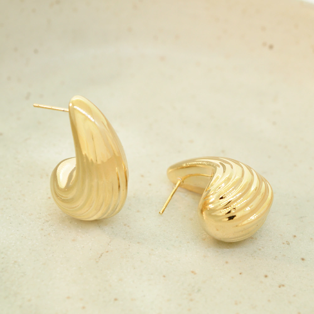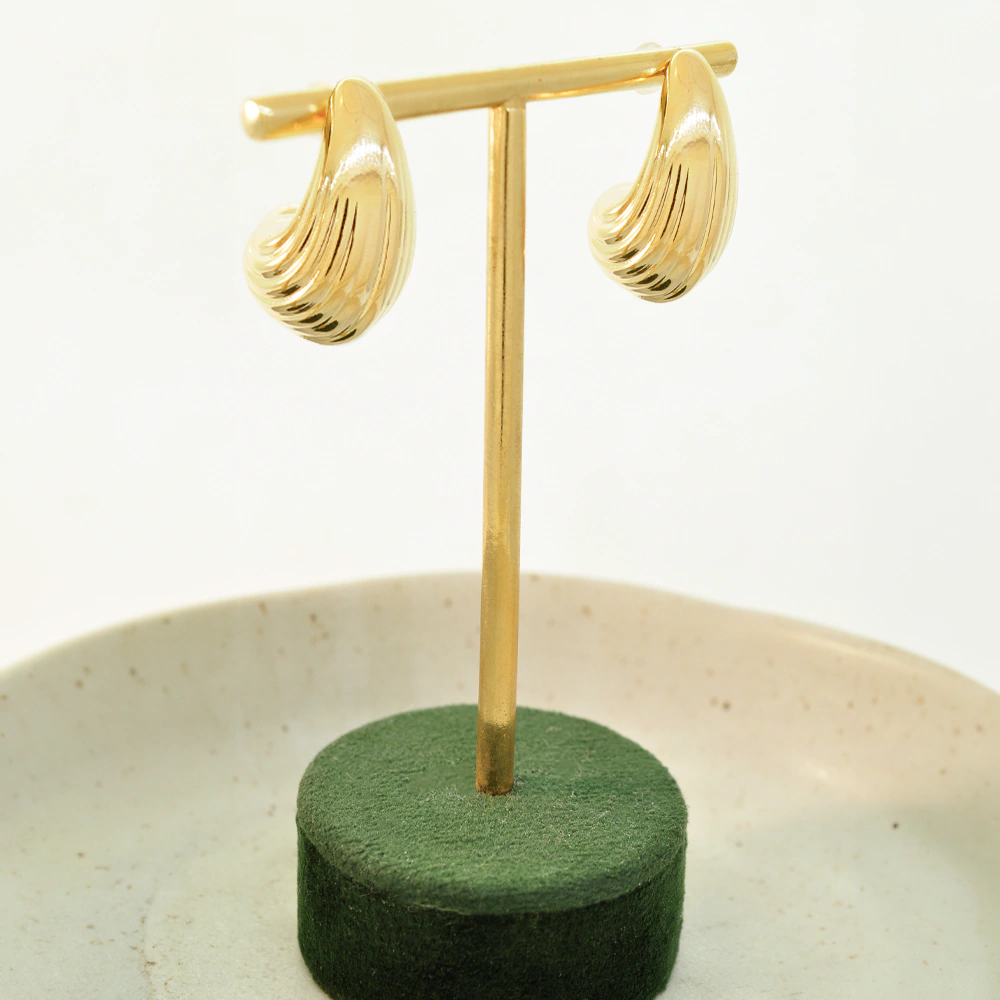 O formato de gota com superfície riscada cria um efeito visual único, perfeito para produções elegantes ou para dar destaque a combinações mais básicas. Uma escolha versátil para o dia a dia ou ocasiões especiais.