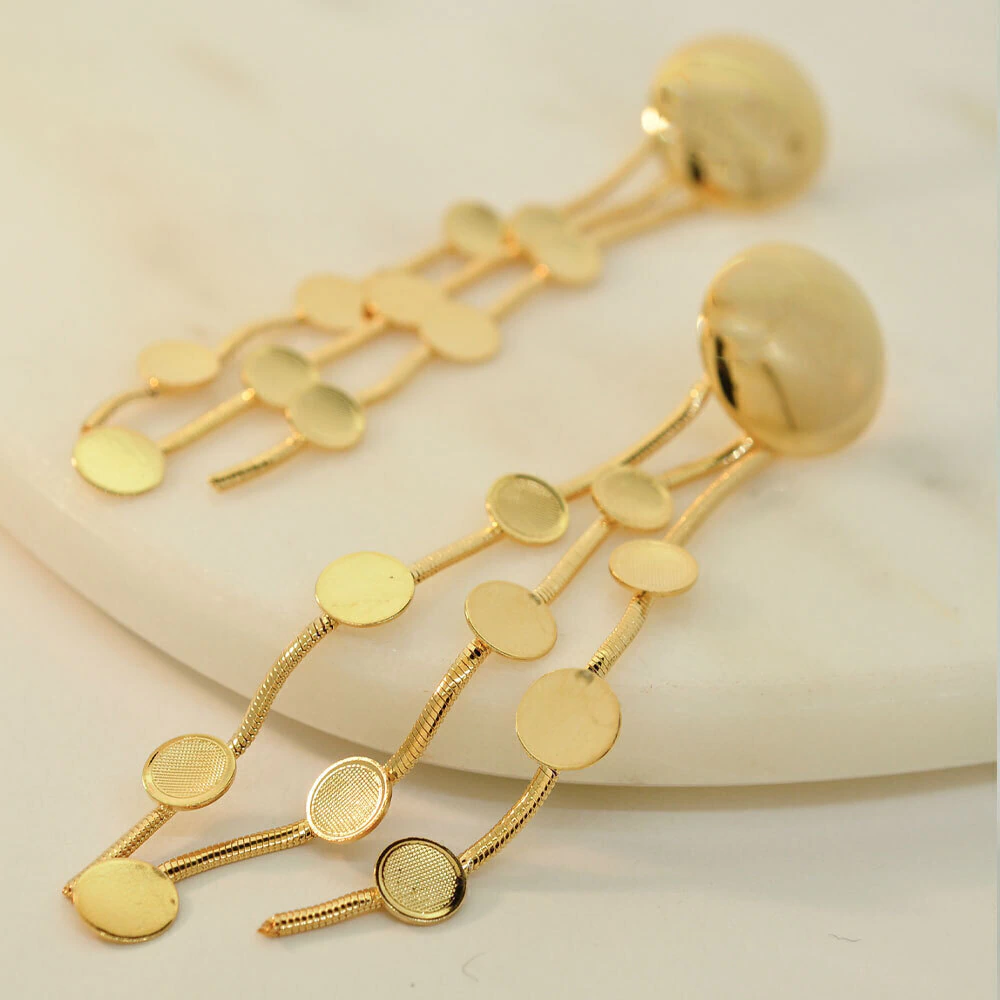 O Brinco Semijoia Dunas Cascata Dourado traz uma proposta leve e elegante, com fios metálicos que se alongam em diferentes alturas e discos polidos que captam a luz com suavidade. Seu design orgânico remete ao movimento fluido das dunas ao vento, criando um efeito visual encantador a cada passo.