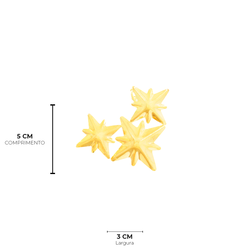 É uma semijoia com banho de ouro 18k, brinco três estrelas é estiloso e moderno. Opte por uma maquiagem mais neutra para destacar o acessório, ou ouse com um delineado gráfico para um toque fashionista, combine com roupas leves, como batas, vestidos soltos e saias longas. Use com penteados presos, como coques ou rabos de cavalo, para destacar o design eles são marcantes e podem ser usados em várias ocasiões como em casamentos, formaturas, encontros casuais, festas de fim de ano.