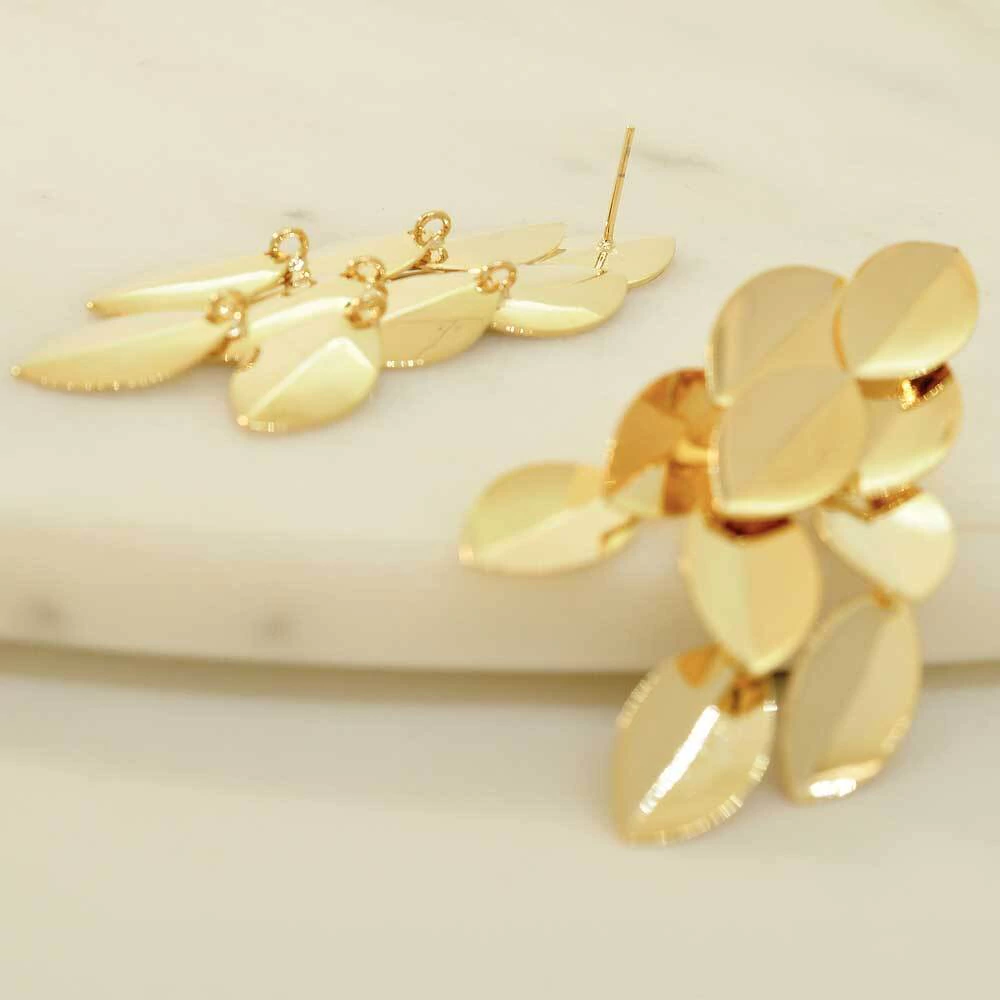 Design orgânico em formato de folhas sobrepostas, criando efeito cascata com movimento suave e acabamento luminoso em banho de ouro 18k.