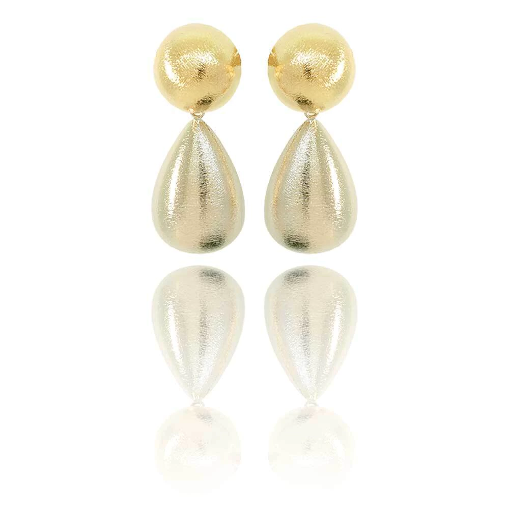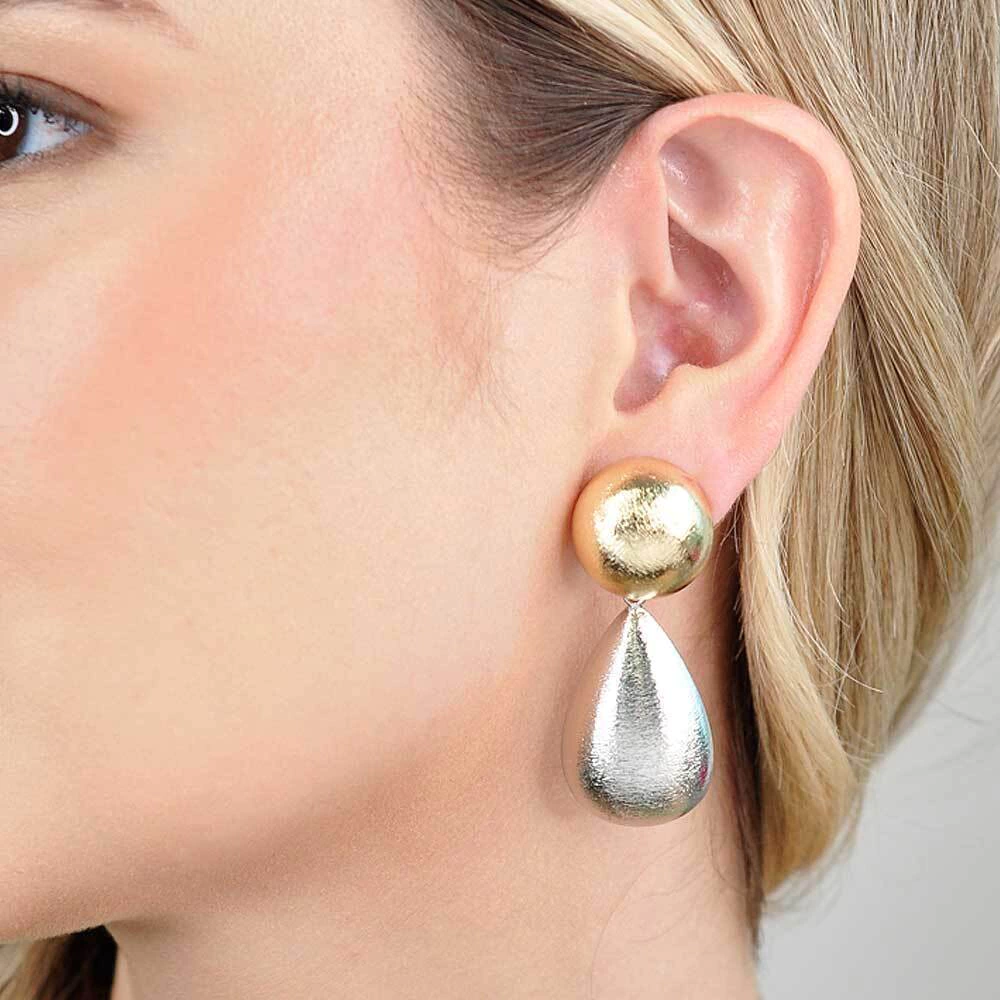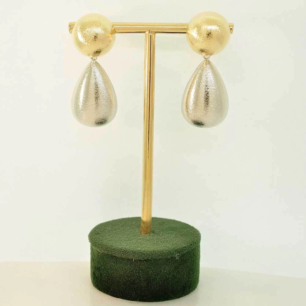 Este brinco apresenta uma composição sofisticada que une a delicadeza da esfera ao charme da gota orgânica, ambas com acabamento escovado, que proporciona textura moderna e toque contemporâneo à peça. O contraste entre o dourado e o ródio valoriza ainda mais o design versátil e elegante.