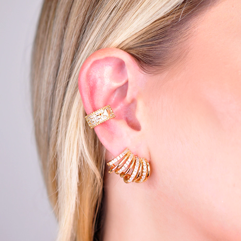 É uma semijoia com banho de ouro 18k, brinco ear cuff liso e cravejado com piercing são tendências incríveis para quem busca um visual moderno e cheio de atitude. Combine o earcuff com brincos menores, como studs ou argolinhas, para um visual equilibrado, use peças que conversem entre si, como um piercing com uma pedra pequena e um earcuff com design semelhante.