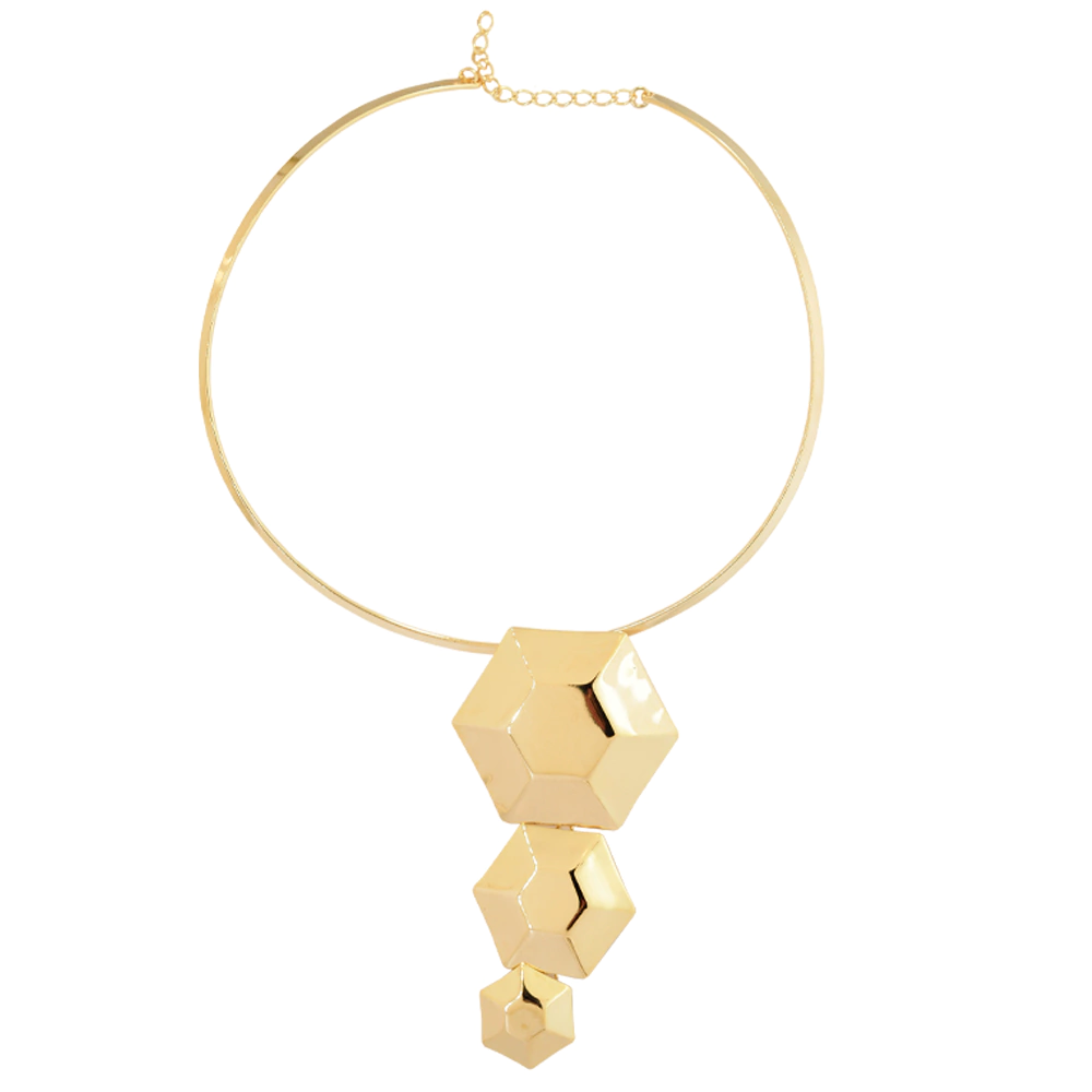O formato rígido do aro, com 12 cm de diâmetro, cria uma moldura refinada para o pescoço, enquanto os três pingentes geométricos adicionam um movimento único à peça. Seu banho de ouro 18K proporciona um acabamento luxuoso e brilho intenso, tornando-a ideal para diferentes ocasiões.