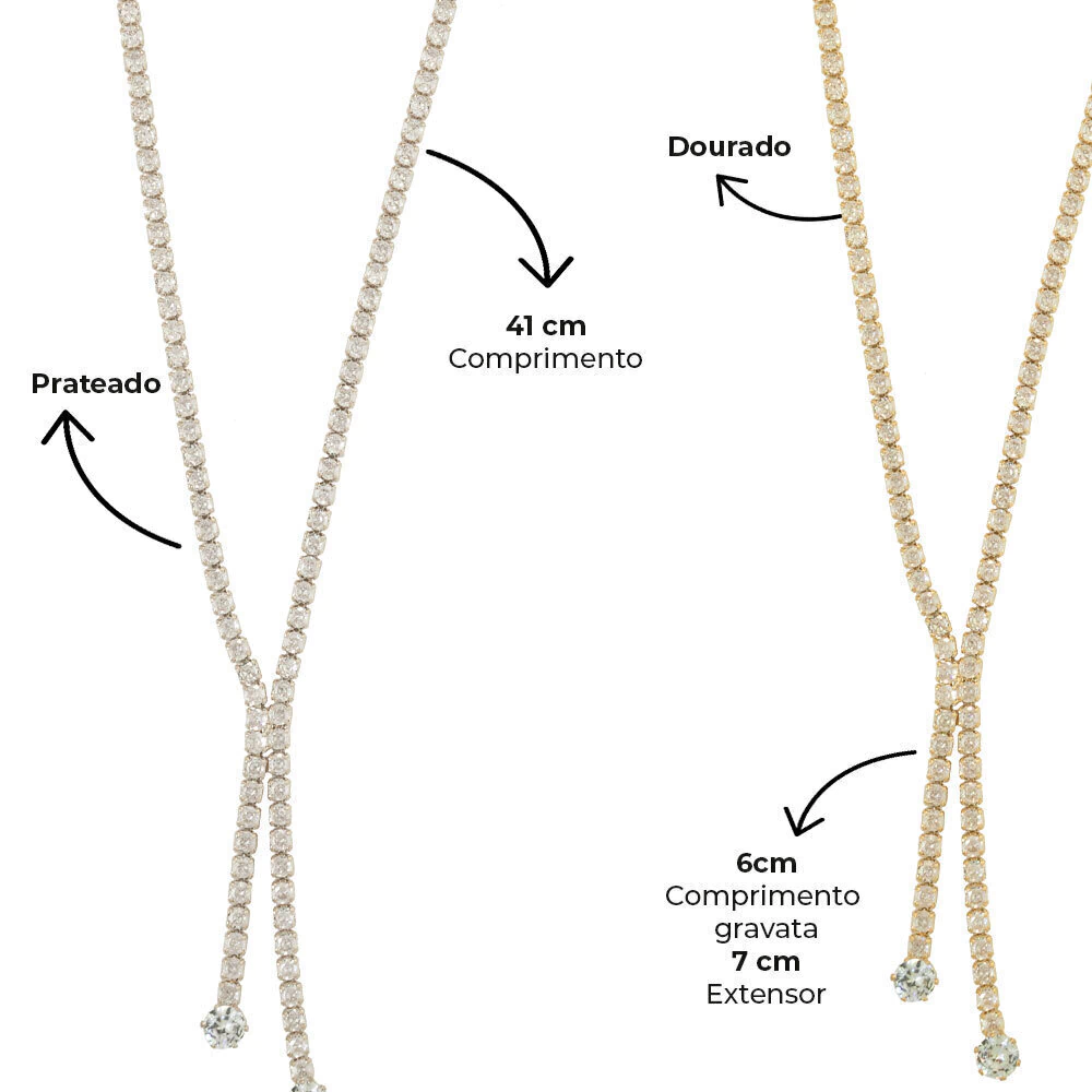 Design: Clássico e minimalista, o modelo destaca-se pelos cristais dispostos em sequência, formando uma gravata delicada que transmite sofisticação e leveza.