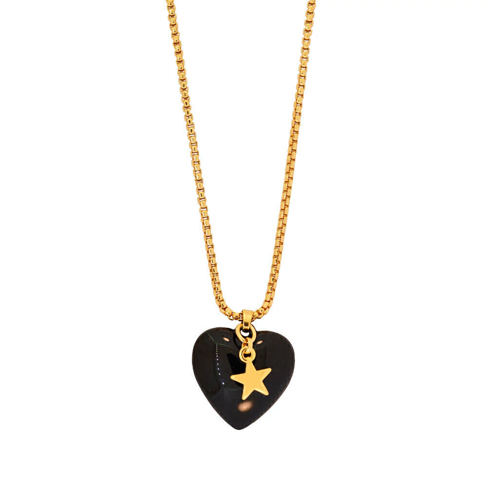 É uma bijuteria em metal dourado, colar coração com pingente estrela é romântico, moderno, minimalista.  É uma escolha versátil para diversas ocasiões, desde eventos formais até encontros casuais.