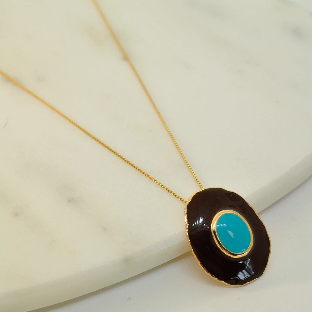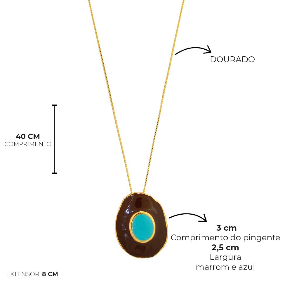 Inspirado em formas orgânicas e na beleza dos contrastes, este colar boho apresenta um pingente marcante com fundo marrom esmaltado e centro azul vibrante. Uma peça que traduz estilo artístico com acabamento moderno e sofisticado.