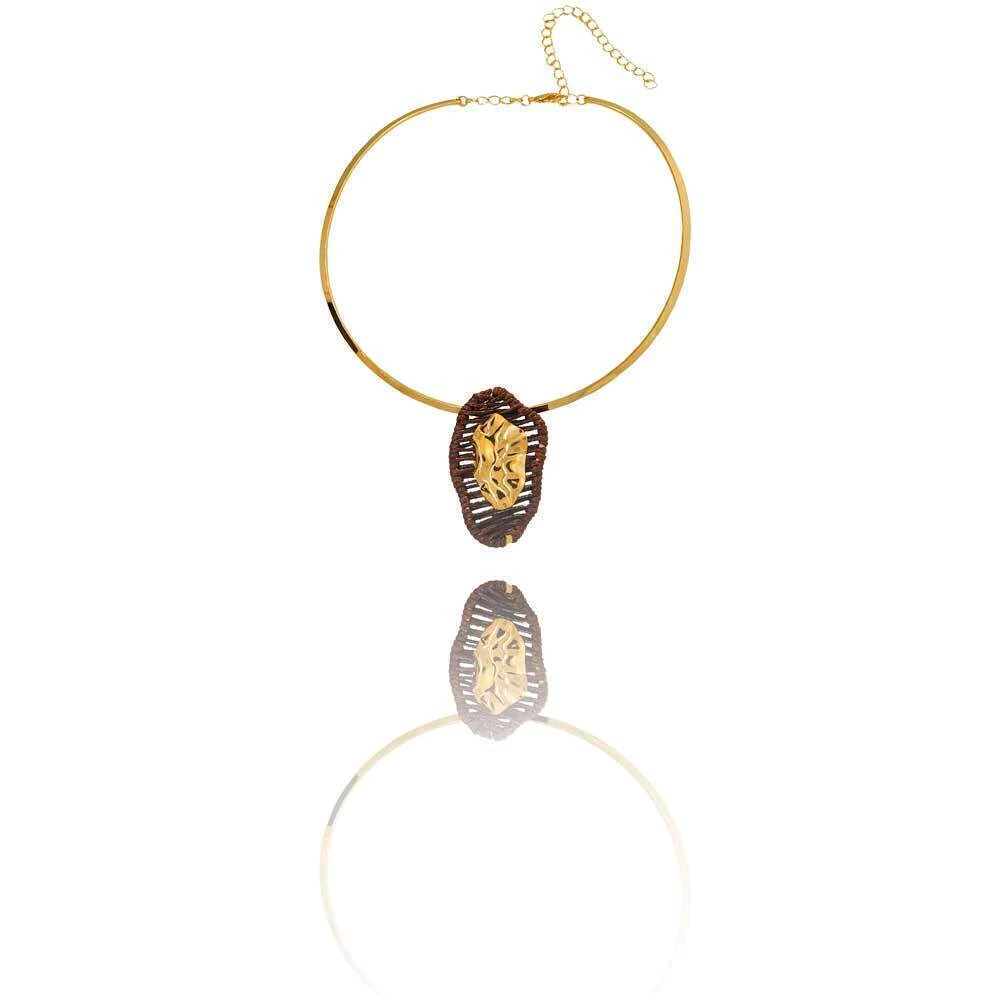 A base é composta por um aro metálico rígido dourado, com acabamento polido, que se ajusta ao pescoço com leveza e conforto. O pingente central mistura palha sintética em tom marrom com aplicação de metal orgânico espelhado, trazendo textura e movimento à peça. O contraste entre o rústico e o sofisticado cria uma composição visual impactante e natural.