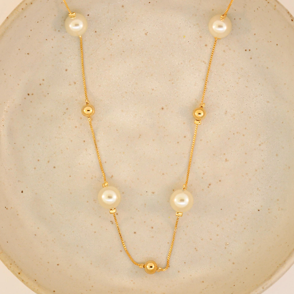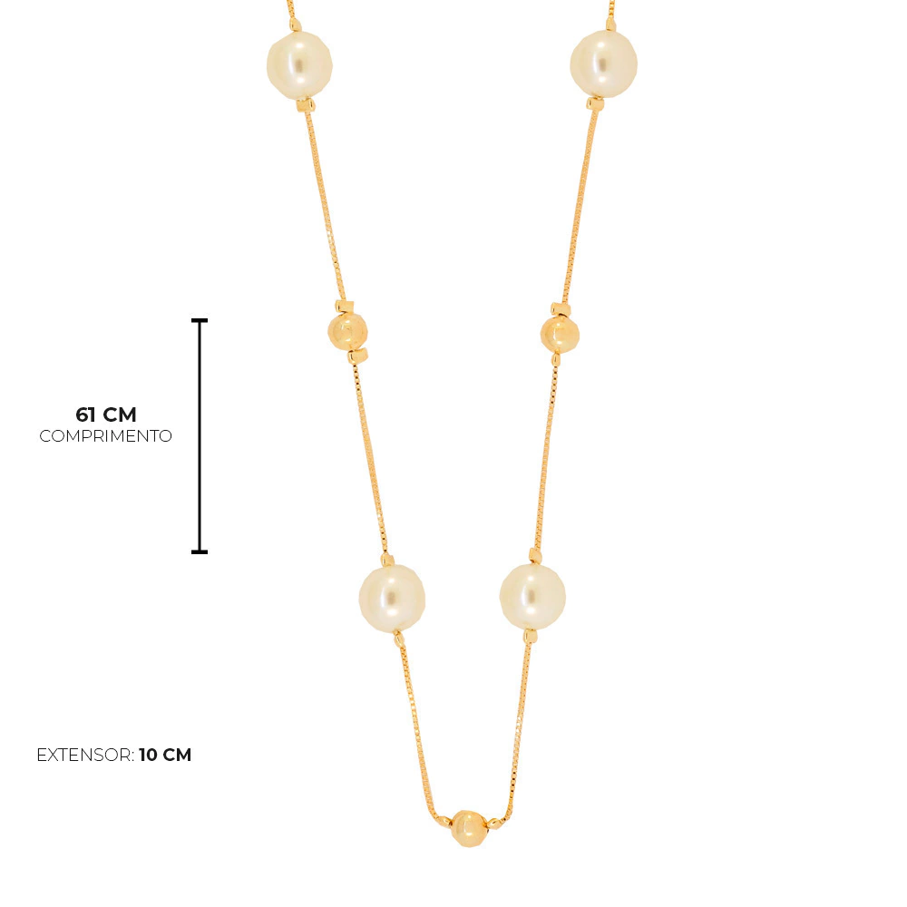 É uma semijoia no banho 18k, um colar que combina pérolas com bolinhas douradas é uma peça que equilibra o clássico com o moderno, oferecendo diversas formas de uso. Para um visual moderno, você pode misturar o colar com outros acessórios dourados, como brincos e pulseiras de metal. Isso cria um conjunto harmônico e sofisticado. Para criar um efeito mais interessante, você pode combinar o colar de pérola com bolinhas douradas com outros colares finos, criando camadas e profundidade ao visual.