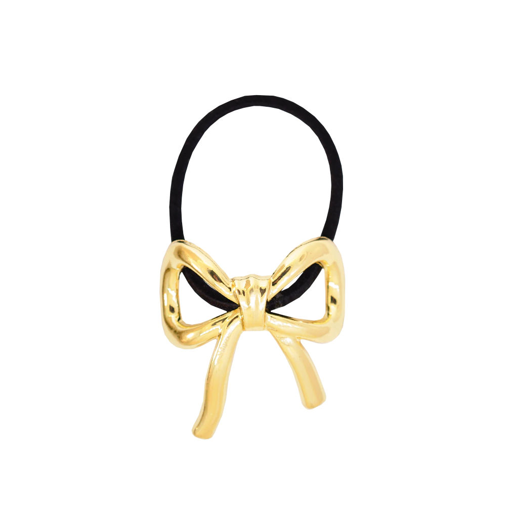 É uma bijuteria em metal dourado, O elástico de cabelo com detalhe de metal em forma de laço é um acessório charmoso e prático que pode elevar o visual de forma simples. Prenda o cabelo em um rabo de cavalo alto, médio ou baixo e use o elástico com laço para dar um toque especial ao penteado. O laço de metal acrescenta um elemento elegante e transforma um penteado básico em algo mais sofisticado.Faça um coque simples e prenda-o com o elástico de laço. Pode ser um coque alto ou baixo, dependendo do estilo desejado. O laço de metal dará um ar delicado e charmoso ao penteado.