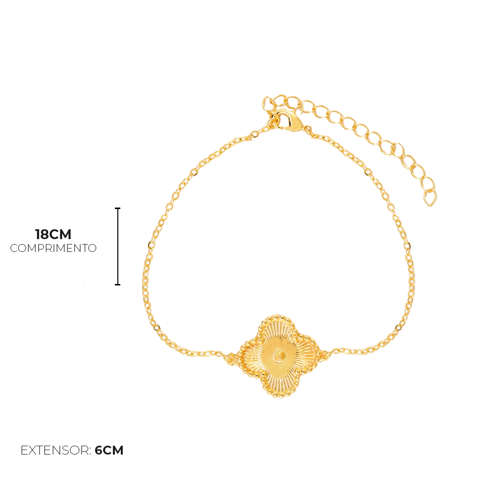 É uma semijoia com banho de ouro 18k, pulseira trevo texturizado pode ser uma peça muito charmosa e versátil para adicionar ao seu visual. Pode ser usado durante o dia oua anoite em diversas ocasiões.